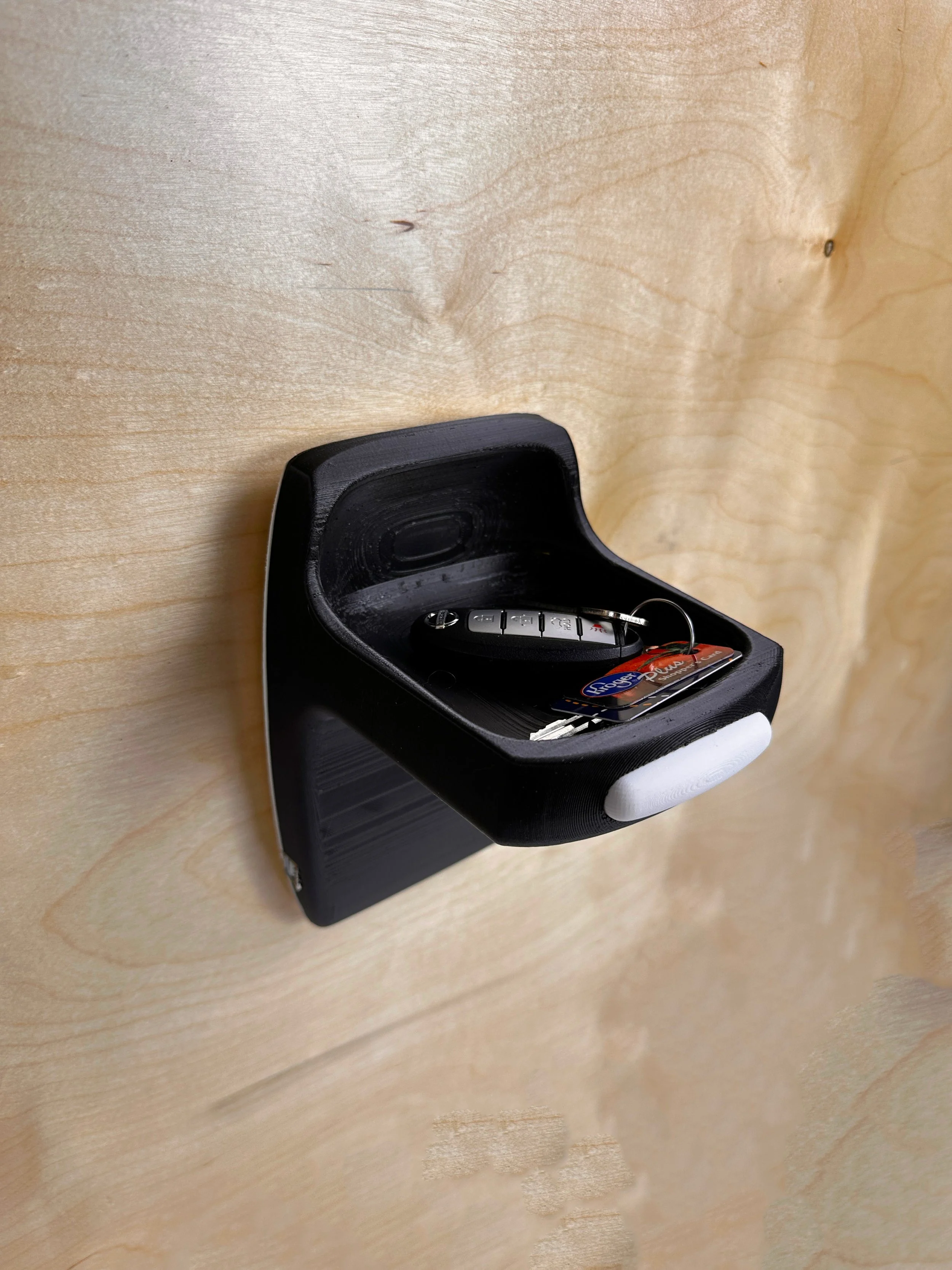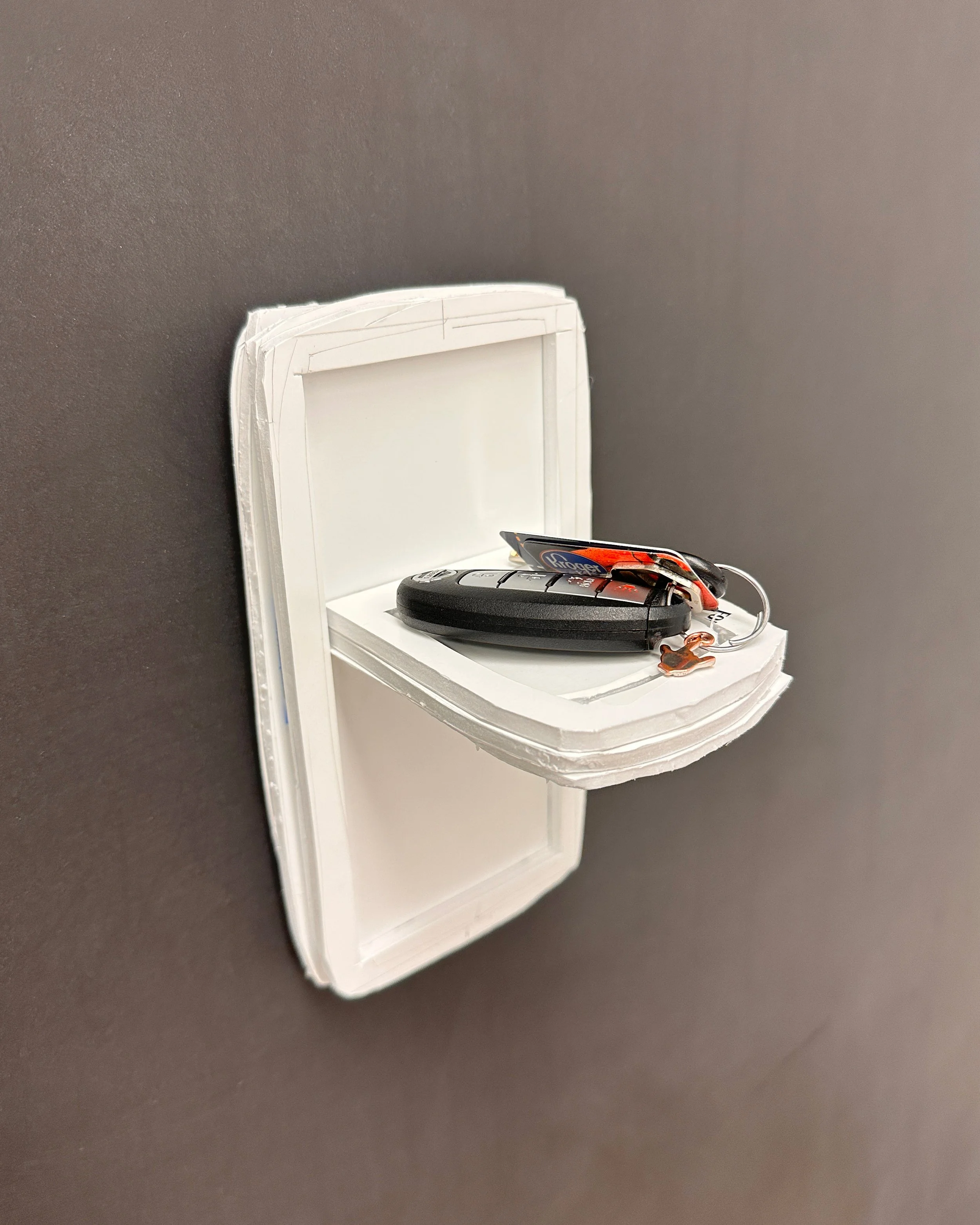 At this stage I was experimenting with the main form I was developing. I wanted to see the physical size of the design, and how different items looked in comparison to it. Here is the model with a set of car keys, to show scale.
