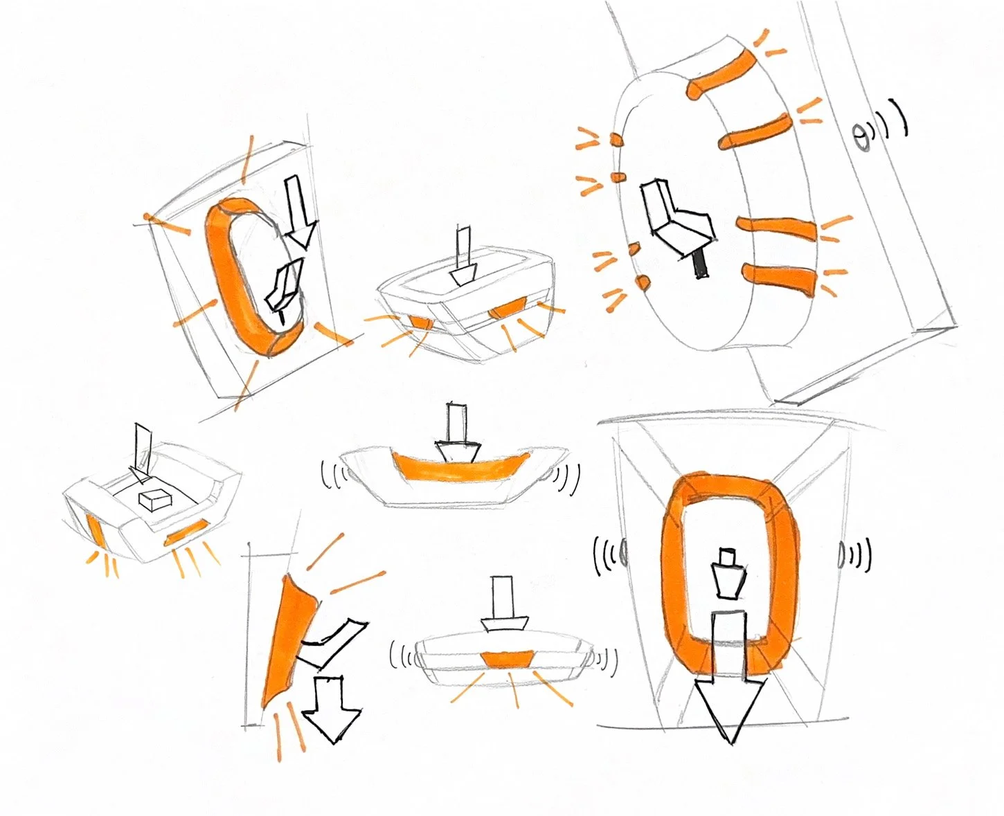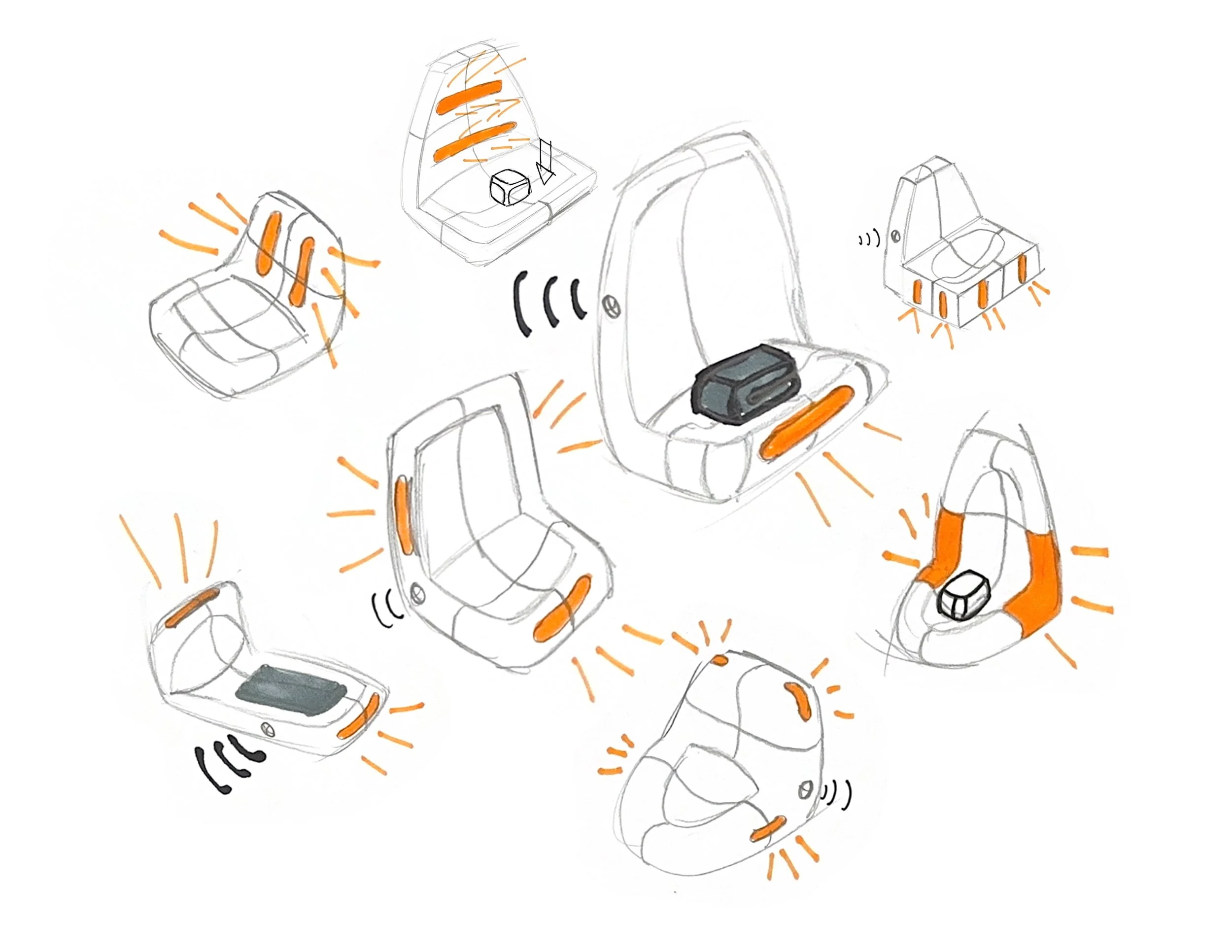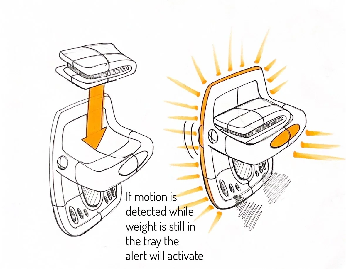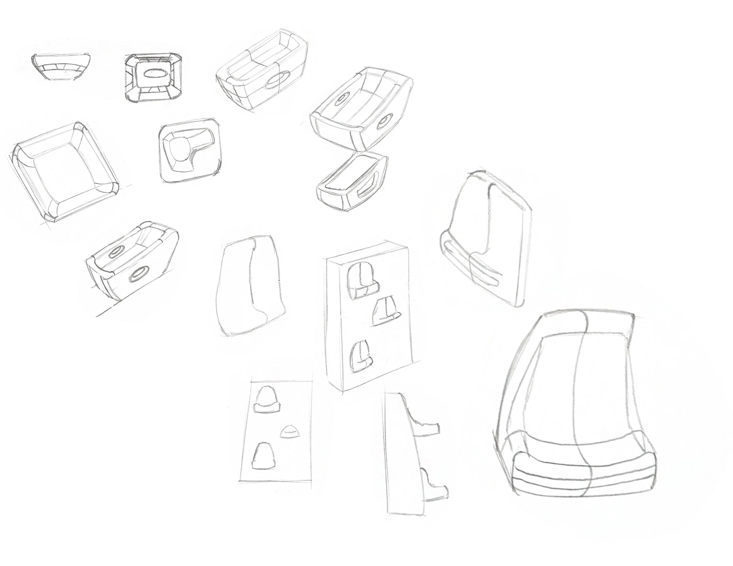 For most of my sketch iterations I was very focused on the user interaction, and how the storage of personal belonging would work. I wanted the lights to accent the form. I wanted to incorporate the primary light almost like a headlight on a car.