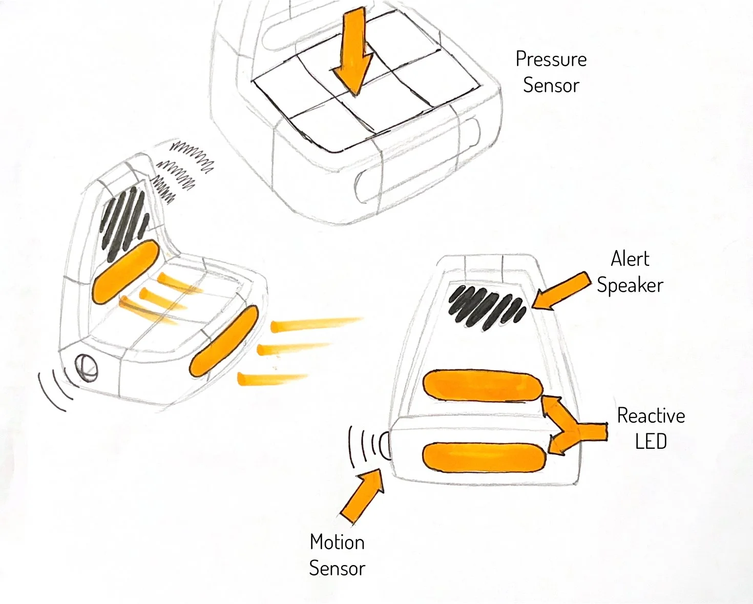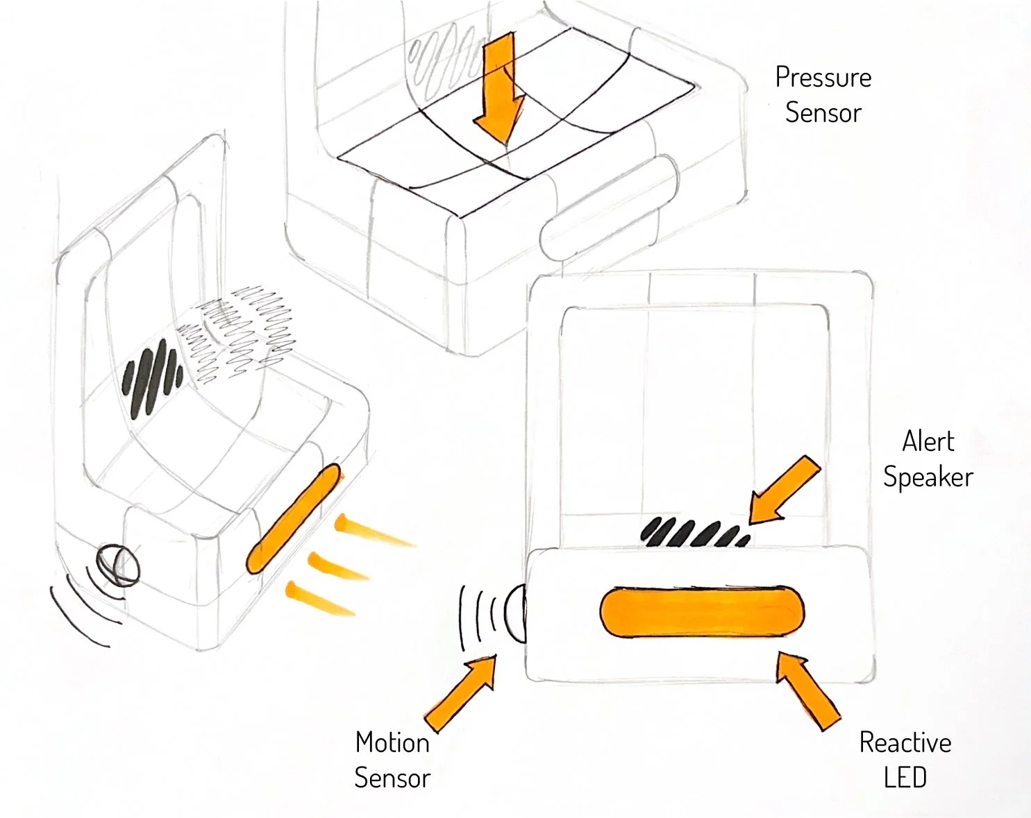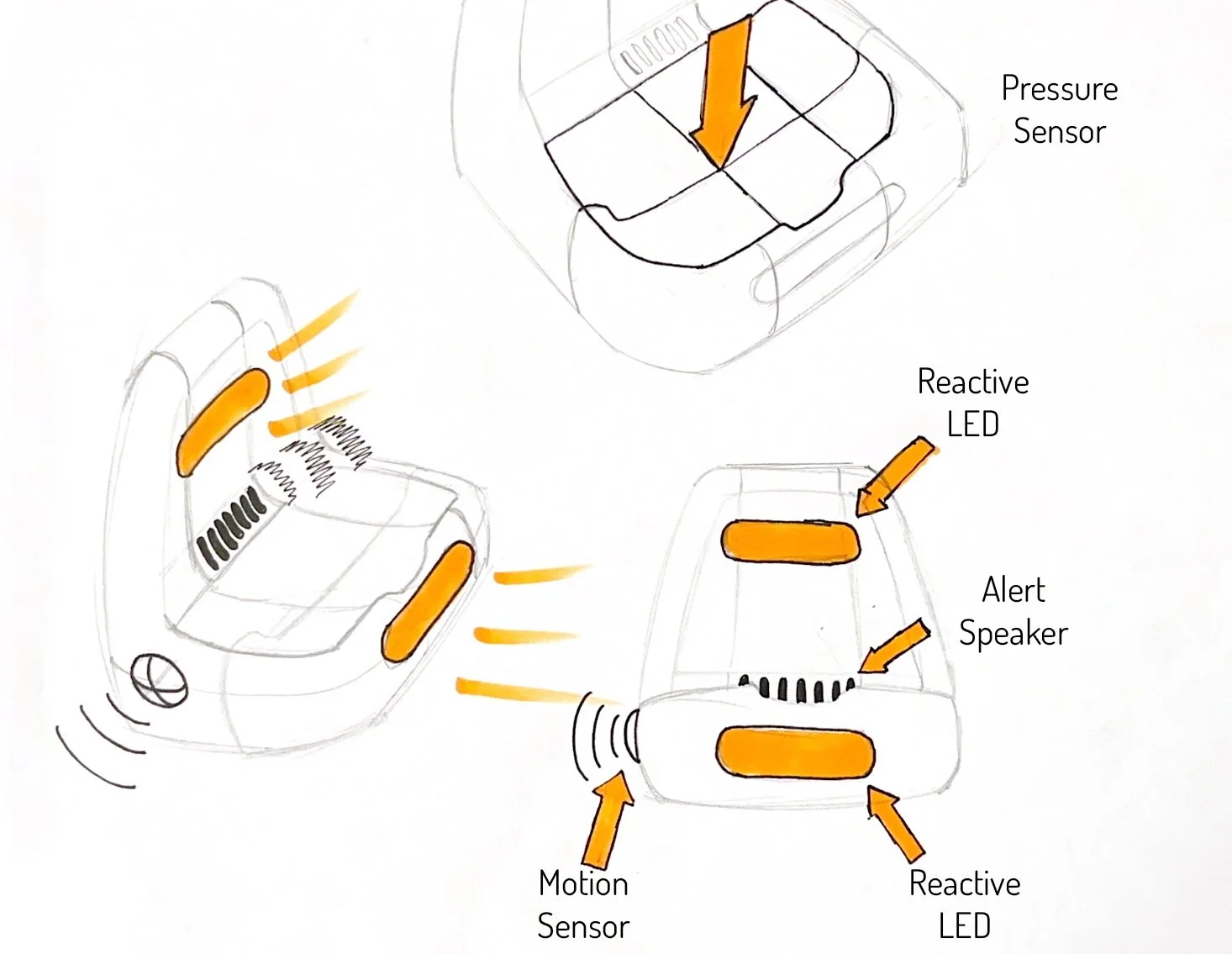 For most of my sketch iterations I was very focused on the user interaction, and how the storage of personal belonging would work. I wanted the lights to accent the form. I wanted to incorporate the primary light almost like a headlight on a car.
