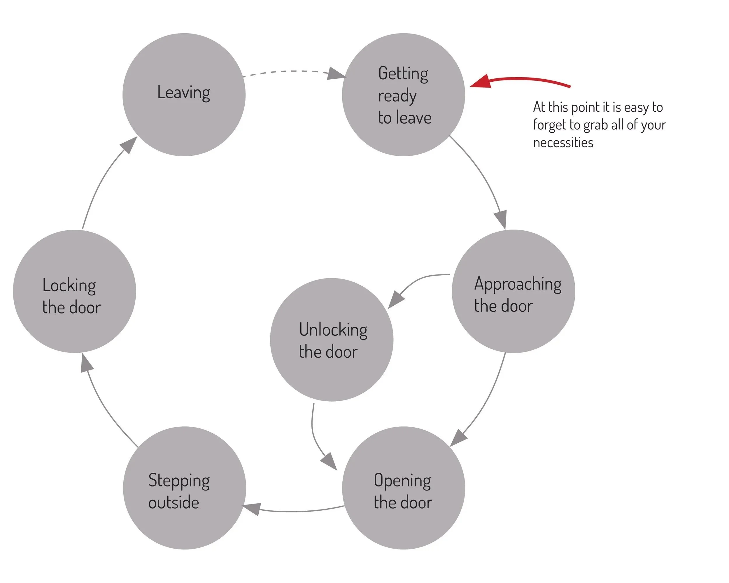 In order to help the user remember their important items this system both gives them a consistent spot to place their items while also helping to always remember to take these items along when they leave.